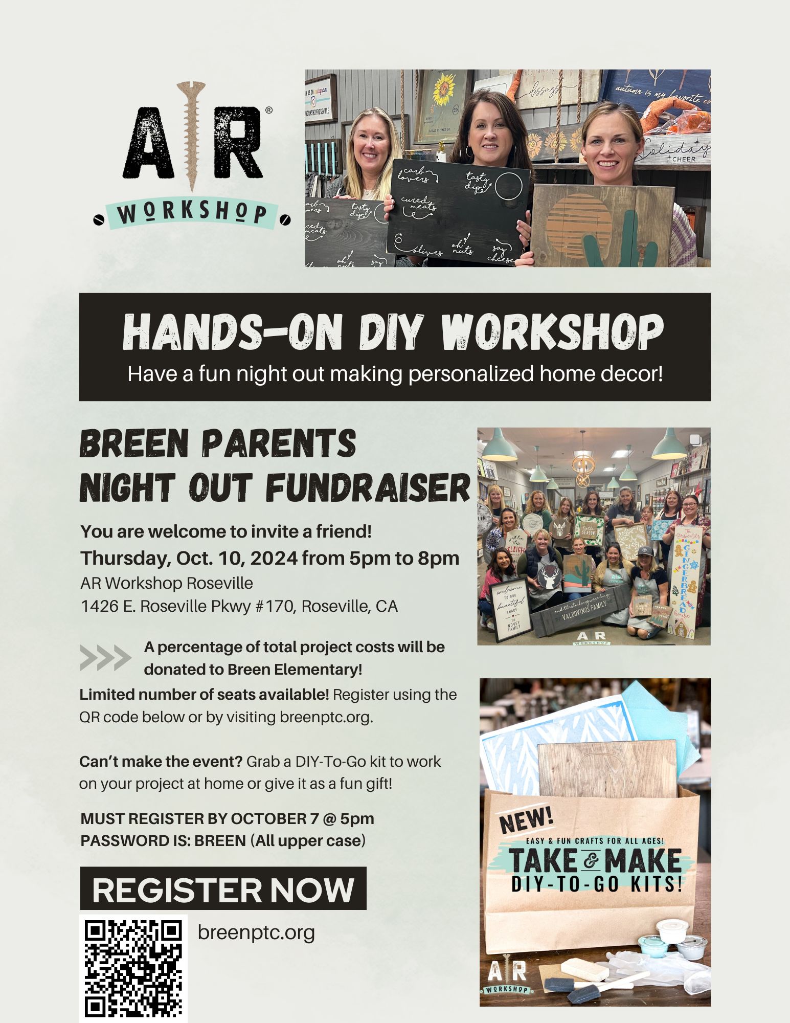Join fellow Breen Elementary parents for a fun night out of crafting your custom project! Register using the link below and select the item you’d like to complete at the event.